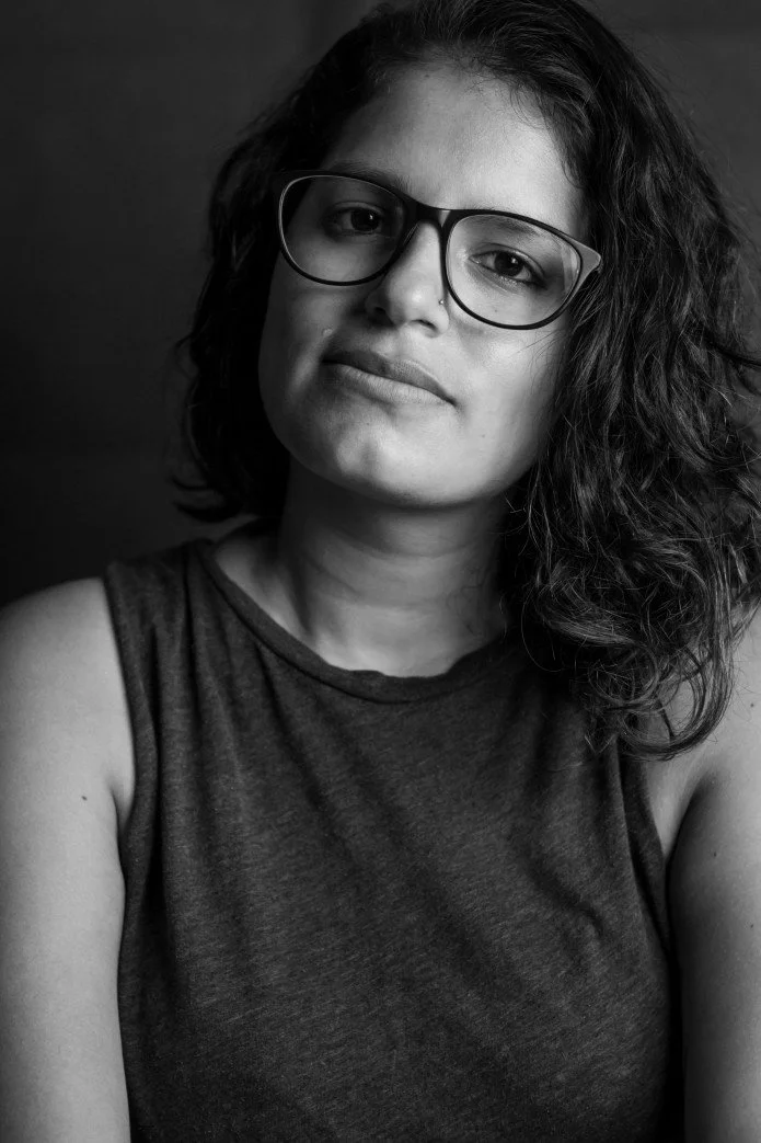 Black and white portrait of Iris Vela Parendes with curly hair wearing glasses and a sleeveless top, looking at the camera.