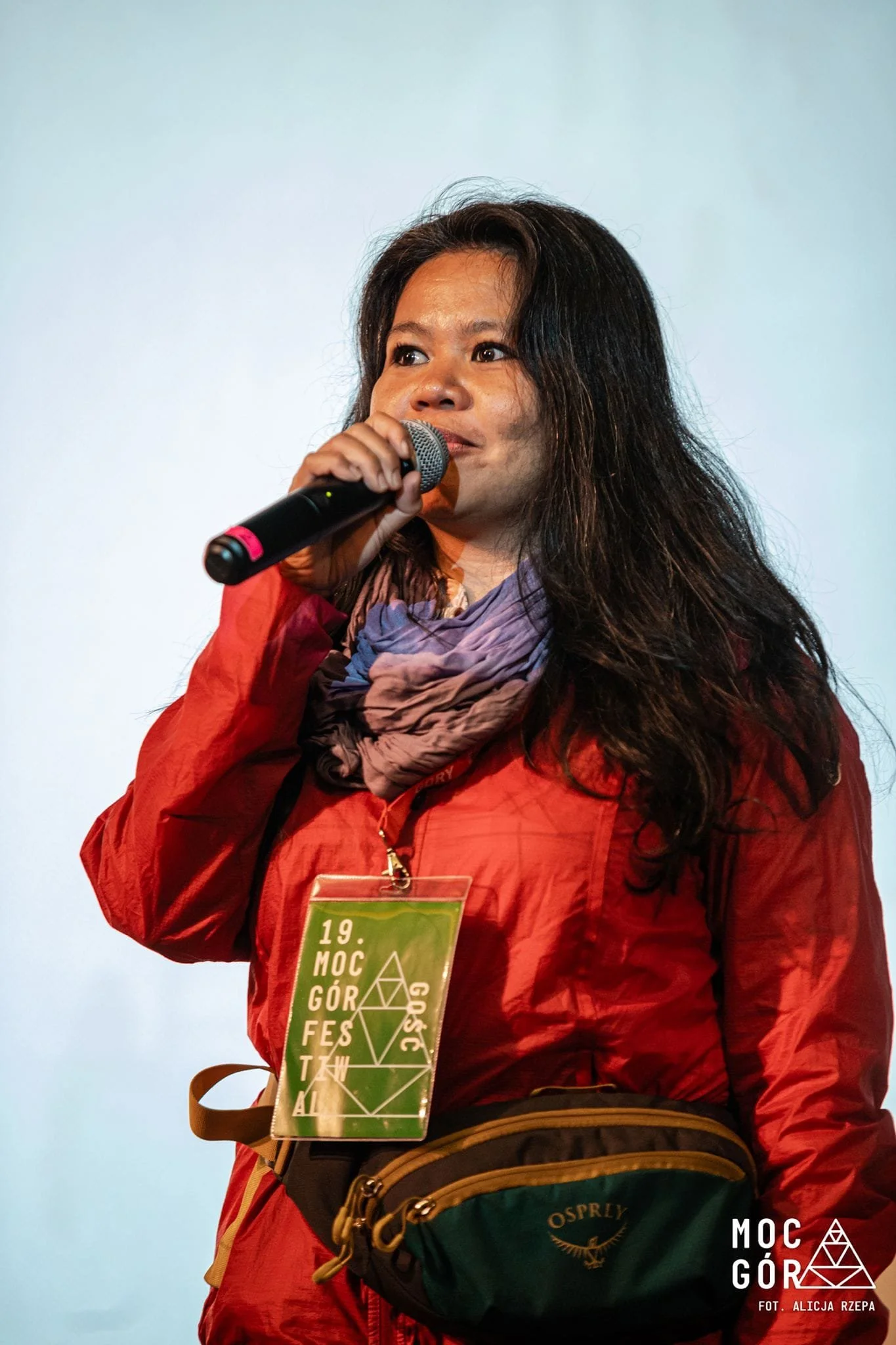 Marinel de Jesus speaking into a microphone at a conference, wearing a red jacket, a scarf, and a badge with event details.