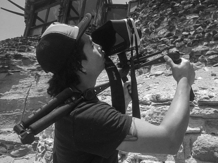 Jose Luis Palomino Escalante wearing a baseball cap and black t-shirt, aiming a camera with a stabilizer on a rocky outdoor site.